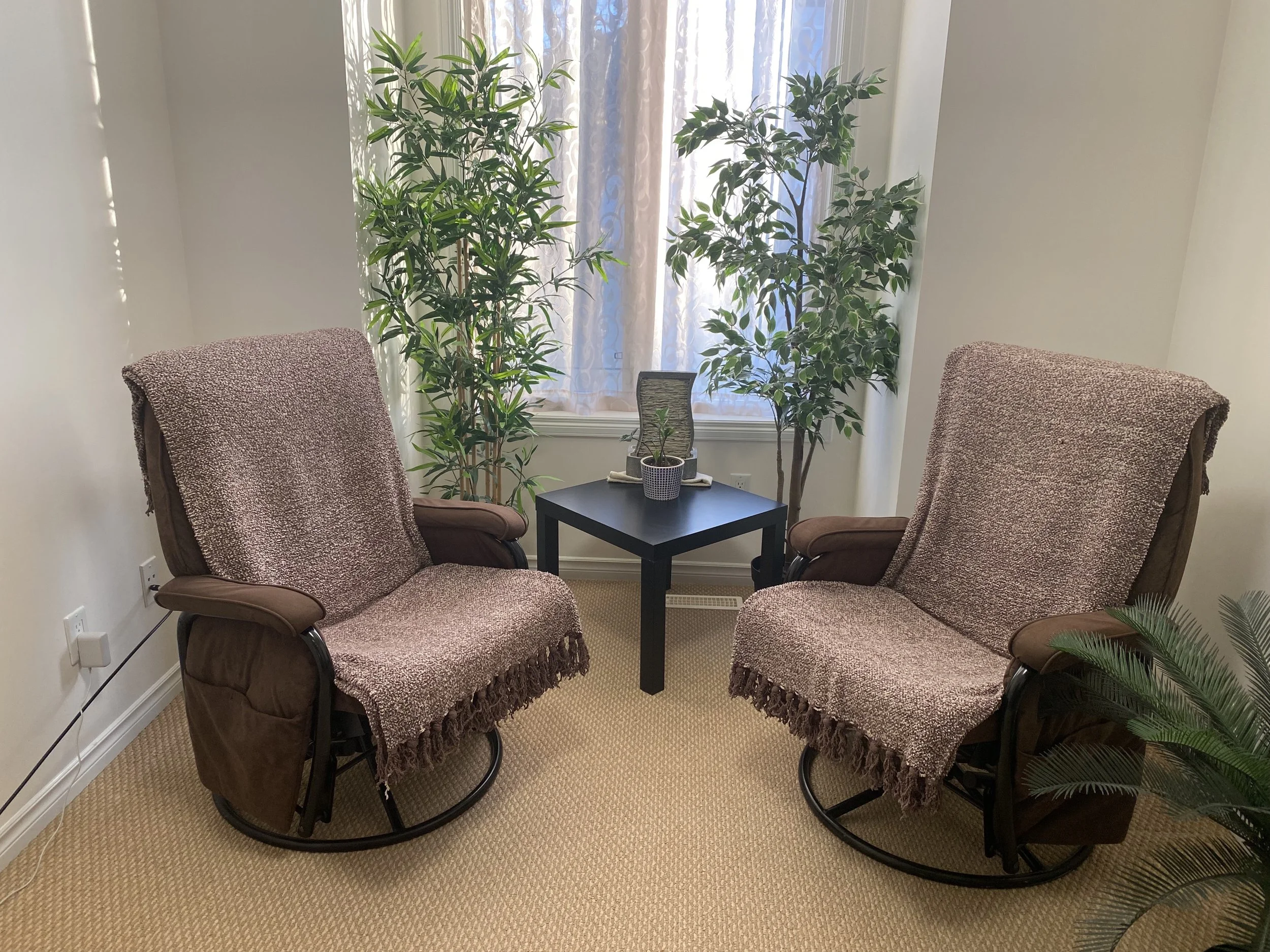 My work takes place in a private, home-based office located in Fort Saskatchewan, Alberta — a space created with warmth, calm, and presence in mind. The room is quiet and softly lit, designed to support grounding and reflection.